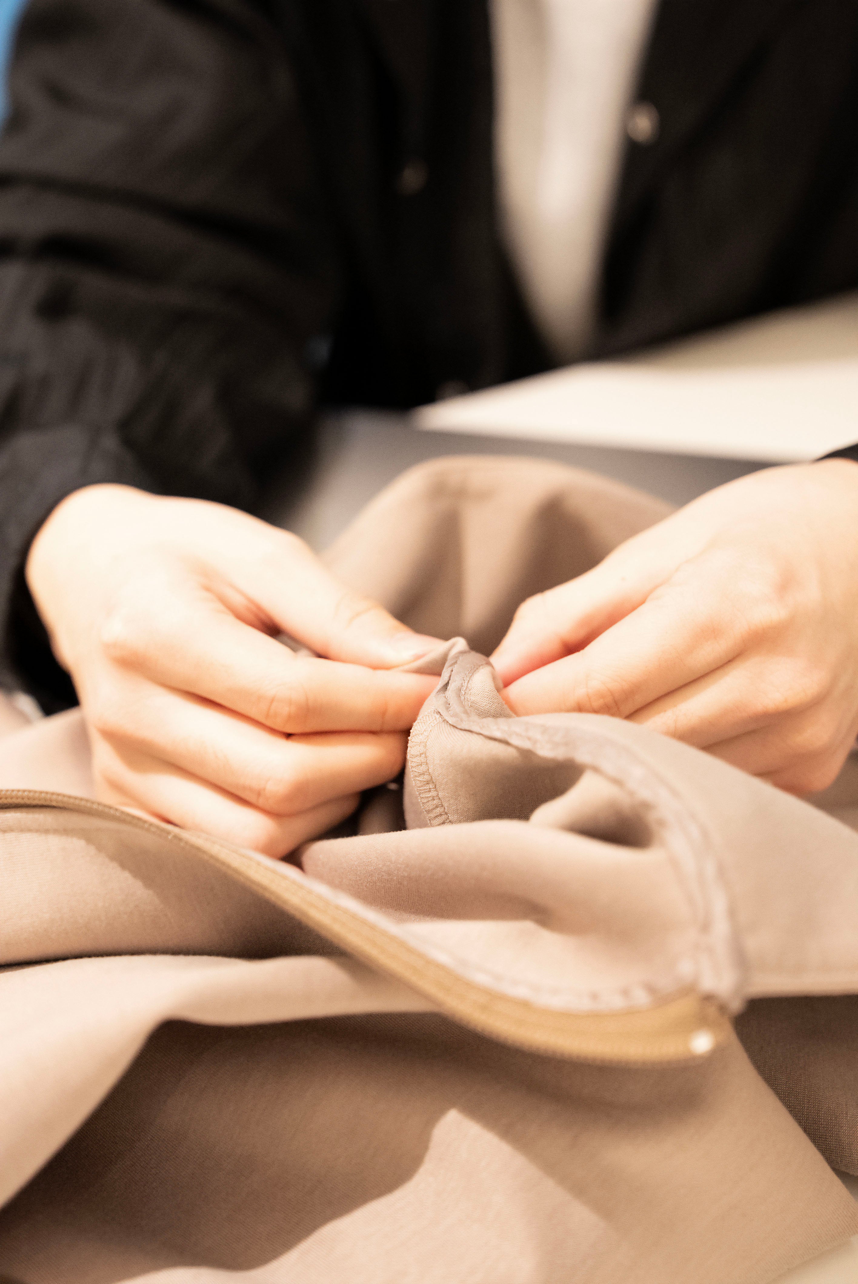 はい、ご自宅でのお洗濯が可能です。洗濯機の場合は「手洗い」「おしゃれ着」「ドライモード」で、洗濯ネットに入れて頂くと長くご愛用いただけます。乾燥機は生地が伸びてしまう可能性があるので避けてください。